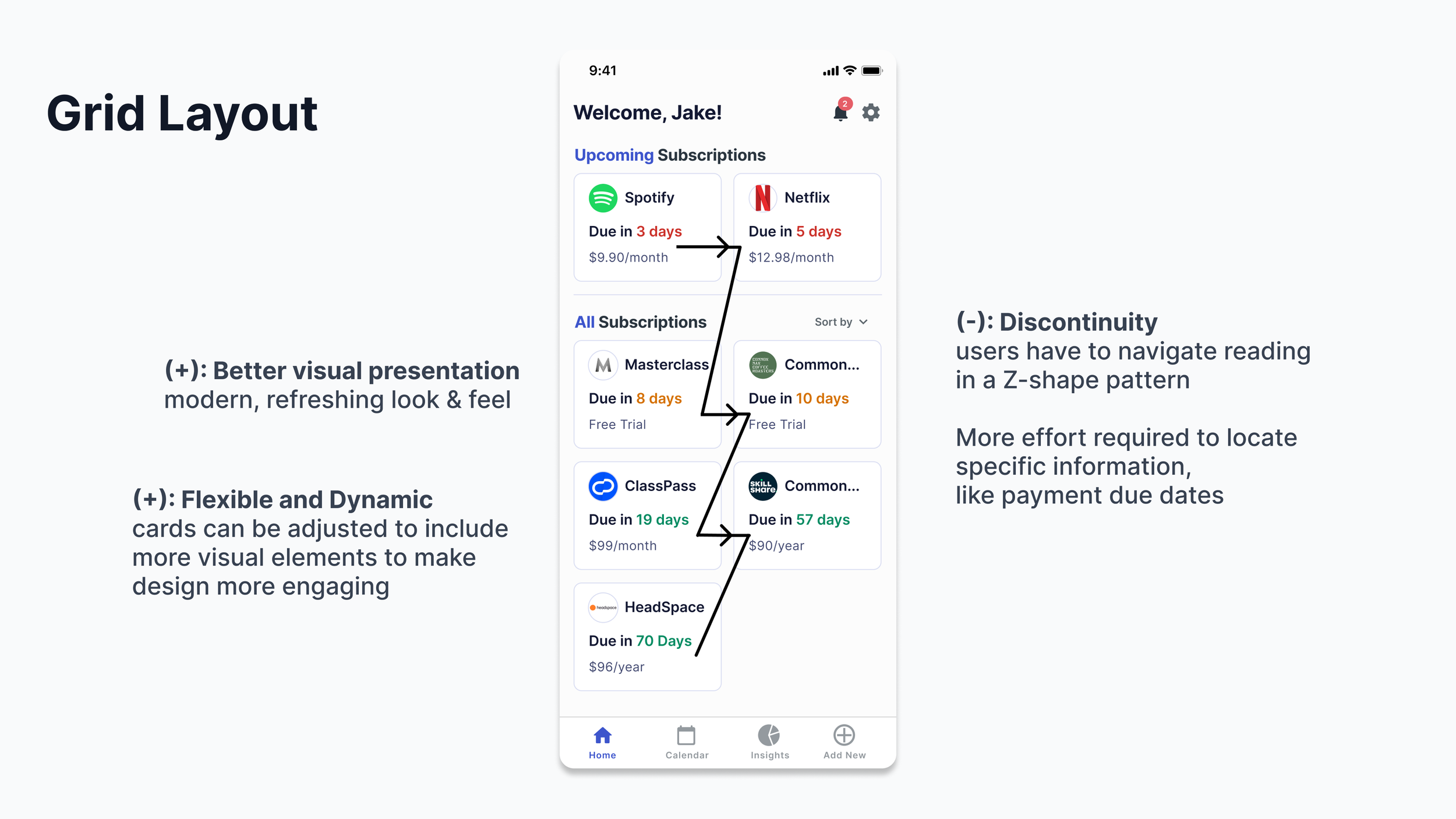 When we are thinking about designing for time-sensitivity, we also have to take into account the content layout of the dashboard. In my design exploration, I have considered using both a grid and list layout. Let’s talk about the pros and cons of each type of layout.